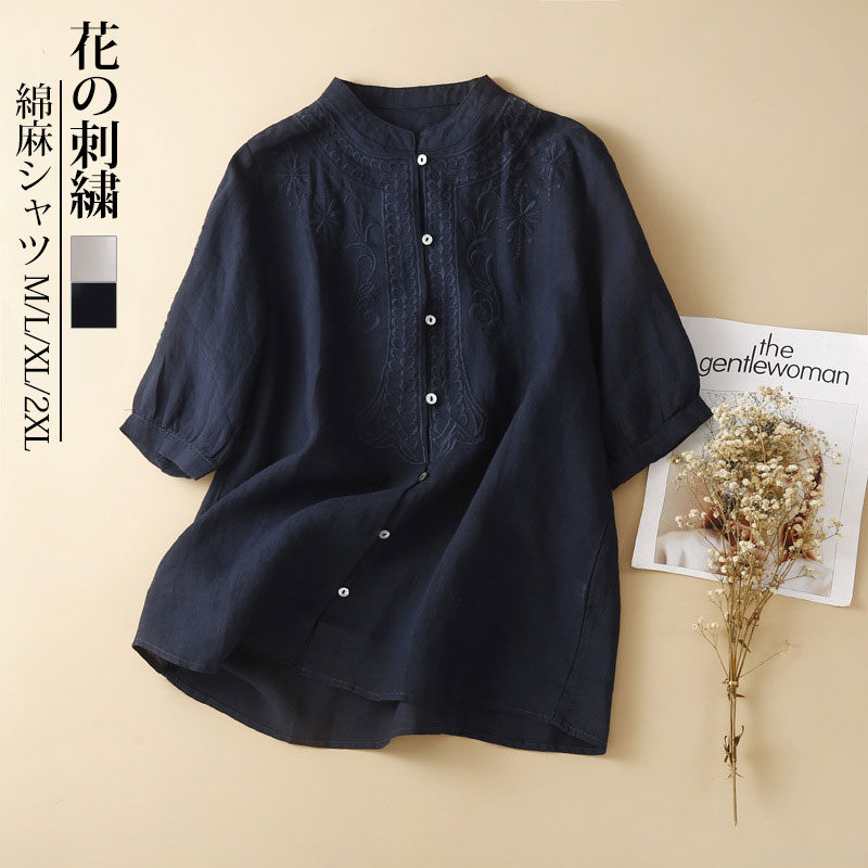 ▼おしゃれな刺繍の入ったリネンシャツで自慢のばーばに変身!